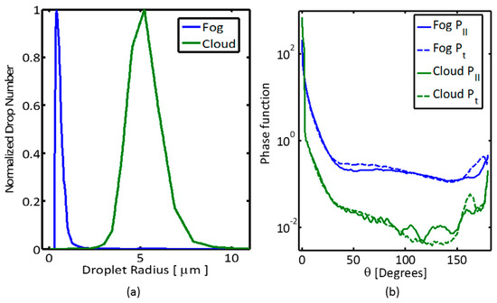 It can be seen from Figure 3 that the two different aerosol media have distinctive droplet size distributions. The “fog-like” scattering intensity is larger than that of the “cloud-like” one, because fog droplet sizes are closer in scale to the light wavelength, and hence the radiation transfer is within the size parameter values of the “Mie regime”. We can discern that scattering angles of 0° and 180° are unique points where both polarization components are equal, with a depolarization of zero.