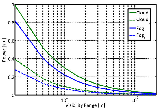 For practical reasons, it is easier to describe atmospheric attenuation in terms of visibility range. The transmittance itself can be measured easily using a transmissometer. The visibility range is defined as the range at which the atmospheric transmittance falls to 2% (Koschmieder’s equation [31]):