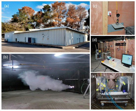 (a) Israel Institute for Biological Research (IIBR) aerosol chamber. (b) Initial filling of an artificial cloud into the chamber. (c) External view of one of the diodes that served for transmission measurements. (d) External chamber wall, showing remote control instrumentation. (e) Spraytec instrument for measuring the droplet size distribution in real-time.