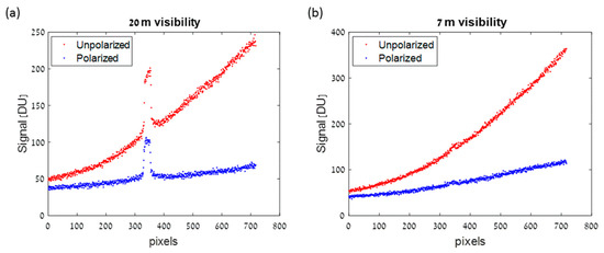 Received video line signal at polarized, (blue line) and unpolarized (red line) cameras. The video line contains a black background with a white object at the middle of the frame. The target width (about 8 cm) corresponds to 23 pixels. (a) At cloud visibility range of 20 m, the white object can be clearly seen. (b) Taken at a visibility range of 7 m, the object cannot be observed despite the very similar received cloud signal at the polarized camera.