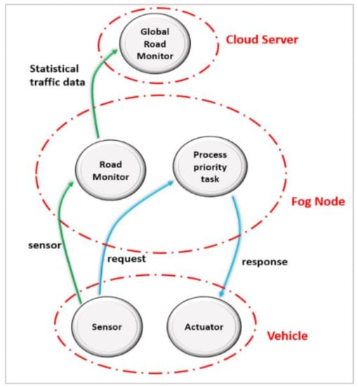 - Process Priority task: this module is placed at fog nodes and is responsible for processing priority requests from a user. The results are then sent back to the user. An application in iFogSim is specified as a directed acyclic graph (DAG) = (M, E), where M represents the deployed application modules M = {m1, m2, m3, …, mn}, e.g., process priority task, road monitor, and global road monitor modules. ‘E’ represents a set of edges describing data dependencies between application modules, as illustrated in Figure 2.