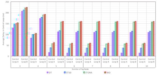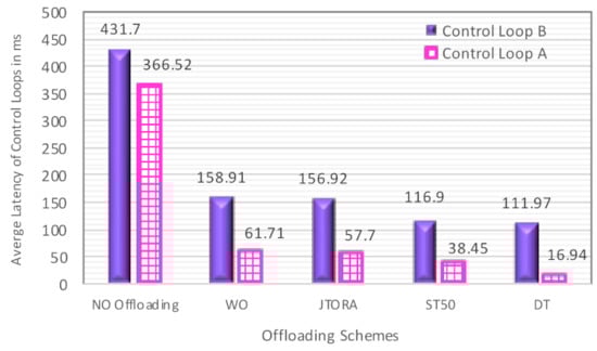 In addition, the delay was higher in the WO scheme compared to JTORA; this was due to a communication overhead caused by sending tasks to a broker node first, which in turn decides whether to process these tasks at the primary fog node or any underutilized neighbor. The least delay was achieved for both control loops when applying our proposed algorithm, DT, compared other benchmarks.