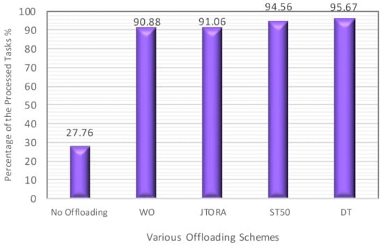 The impact of various offloading schemes on throughput is shown in Figure 6. It can be seen that the lowest percentage of processed task was when no offloading was applied; this was obvious as most of the tasks were waiting in the queue to be executed by the primary fog nodes. The impact of sharing workload with any underutilized neighbors was very clear in WO and JTORA schemes, resulting in processing almost 90.88 and 91.06% of tasks, respectively, compared to 94.56 and 95.67% in ST50 and DT schemes, respectively.