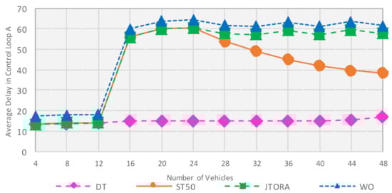 The impact of increasing the number of vehicles was to investigate how the delay was maintained as we increased the workload in the online system. In this experiment, the total number of fog nodes was set to seven and the number of vehicles ranged from 4 to 48. In Figure 7, we can observe that when the number of vehicles was small, between 4 to 12 vehicles, the DT, ST50 and JTORA schemes exhibited an identical pattern. This was because the generated workloads were small, resulting in the primary fog nodes processing most of these workloads themselves. When the number of vehicles increased, all three approaches, ST50, JTORA, and WO, showed a dramatic increase in delay compared to DT, which displayed a stable pattern with a slight increase in delay that increased as the number of vehicles increased.