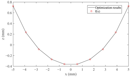 We take the permanent magnet whose x coordinate of the center is at zero as an example. The shape of the optimized curved surface of the permanent magnet is shown in Figure 6. The data used to construct the curved surface shape are obtained according to the optimization results. It can be seen that the shape is similar to a sine or power function. The least squares polynomial fitting is used to fit the data. By comparing the results of a polynomial of degrees 2, 3, and 4, the fitting of the polynomial of degree 4 is more accurate. The polynomial of degree 4 is chosen. For better expression and without affecting the accuracy, the first- and third-order terms with very small coefficients are removed, and the sum of squares due to error (SSE) is 1.376 × 10−10 m2. The computed data of the polynomial is also shown in Figure 6 and the expression is as follows