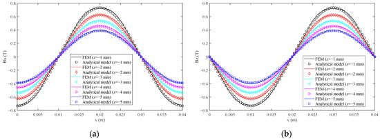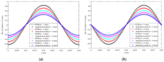 The applicability of optimization results is also analyzed when the height of the permanent magnet is changed. The magnetic flux density of the analytical model and FEM are compared when ht(i) (i = 1, 2, …, 5) takes 5 mm and 15 mm, respectively, which are shown in Figure 10 and Figure 11.