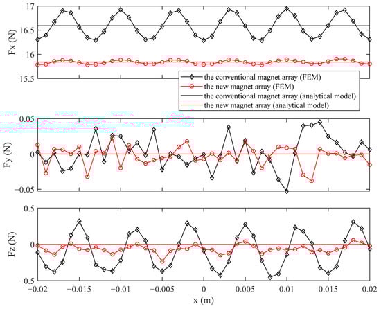 It is found that the new magnet array still has a small force ripple with the small air gap from Figure 15. The correction coefficient is verified by analyzing the RMS values of the error between the analytical model and FEM from Table 6. The RMS(∆Fy) of the new magnet array is also very small. Compared with the conventional magnet array, with the air gap of 1 mm, the force of the new magnet array is higher and the RMS(∆Fx) and RMS(∆Fz) values are also relatively low, which are 23.11% and 32.82% of the conventional magnet array.