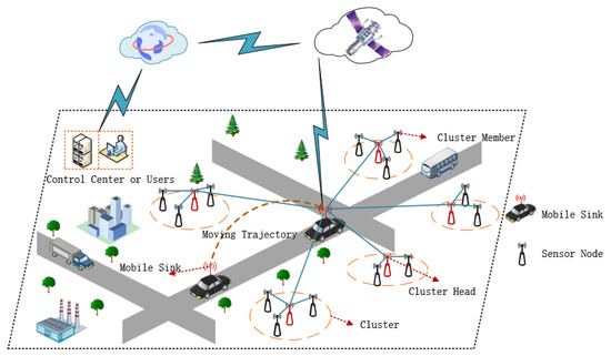 It can be clearly seen from Figure 1 that all sensor nodes are divided into different clusters. There is a sensor node in each cluster as the cluster head to collect and process the monitoring data of the sensor nodes in the cluster. Then, the cluster heads send the data to the mobile sink. Finally, the mobile sink sends data to the control center and users via satellites and Internet.