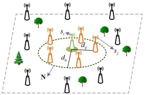 where, is the neighborhood region of node , is distance between node and node . Nodes located in the neighborhood region of node join neighborhood node set , as shown in Figure 4.