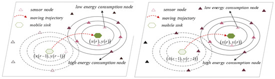 In Figure 5, when the location of mobile sink is , some nodes near the mobile sink will consume less energy during data transmission. When the mobile sink moves to , the relative distance between the sensor node and the base station changes, leading to changes in the energy consumption of the nodes.