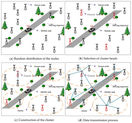 Wireless Sensor Networks (WSNs) are composed of thousands of sensor nodes, which are characterized by small size, low cost and low power consumption. Therefore, WSNs are widely used in military reconnaissance, climate and environment monitoring, natural disaster warning and treatment, intelligent medical technology and other fields [1,2,3]. WSNs can be divided into static wireless sensor networks (static WSNs) and mobile wireless sensor networks (mobile WSNs) according to the types of sensor nodes [4,5]. In the static WSNs, the location of sensor nodes is fixed once it’s deployed. Since nodes with limited energy nearby the static sink node may be assigned as cluster head frequently, leading to high energy consumption of those nodes, thus may cause premature death of those sensor nodes. In mobile WSNs, sensor nodes can move according to specific mission, thus mobile sink may be introduced to alleviate energy consumption of nodes nearby sink node [6,7,8,9,10].