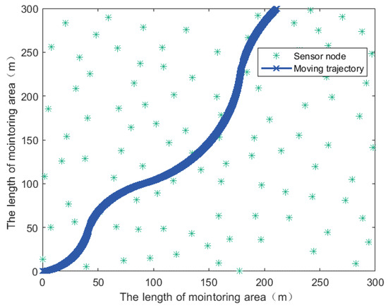 Assume that WSNs composed of N sensor nodes were randomly distributed in the monitoring area . The initial position of the mobile sink was located in the monitoring area with coordinates (0 m, 0 m). The moving trajectory of mobile sink is shown in Figure 10.