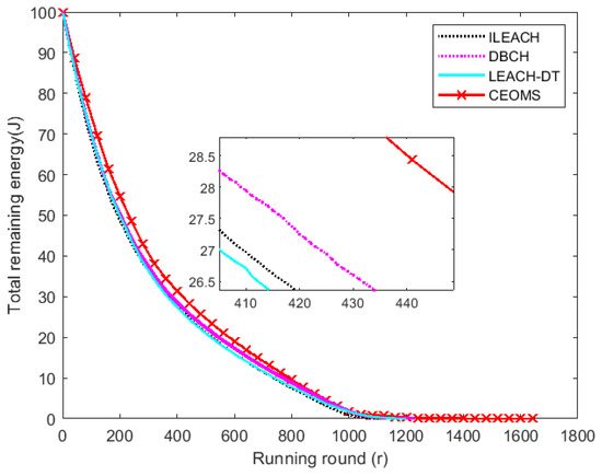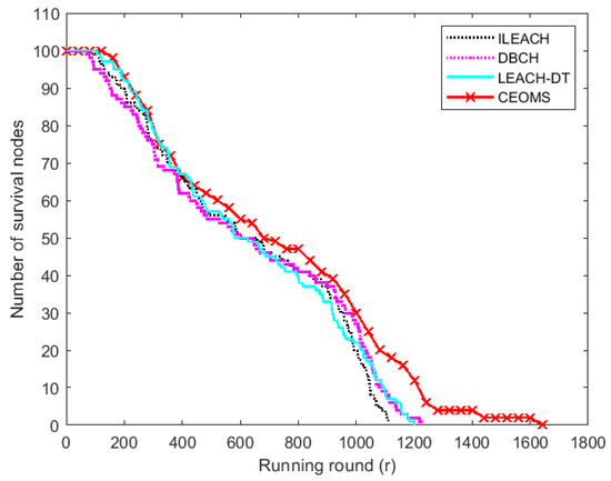 In this figure, the number of nodes was set to be 100 and initial energy of each node was set to be 1 J. It can be found that the curve corresponding to CEOMS algorithm was higher than other three algorithms, which indicated that the total residual energy of WSNs corresponding to CEOMS algorithm was greater than that of other three algorithms. When the total remaining energy of the WSNs was 0, the round of running of ILEACH algorithm, DBCH algorithm, LEACH-DT algorithm and CEOMS algorithm was 1111th, 1225th, 1199th and 1645th, respectively, which indicated the entire network running time of CEOMS algorithm was the longest. Different from the other three algorithms, the CEOMS algorithm took the average remaining amount of neighborhood nodes and the current remaining energy as key factors when selecting cluster heads. So, the CEOMS algorithm could effectively save the network energy and prolong network lifetime.