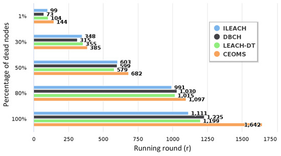 It can be seen from Figure 11 that there were 100 survival nodes at the beginning of the network. With the continuous running of the network, the corresponding curves of the four algorithms all showed a downward trend. With the increase of energy consumption, the number of surviving nodes decreased and death nodes gradually appear. The round of first death node with respect to ILEACH, DBCH, LEACH-DT and CEOMS algorithm were 99th, 73th, 104th and 144th, respectively. Compared with the other three algorithms, first death node time of CEOMS algorithm was extended by 45.4%, 97.3% and 38.5%, respectively. The round of all death nodes with respect to ILEACH, DBCH, LEACH-DT and CEOMS algorithm were 1111th, 1225th, 1199th and 1645th, respectively. Compared with the other three algorithms, the life cycle of the CEOMS algorithm extended by 48.1%, 34.2% and 37.1%, respectively. The relationship between the number of node deaths and the number of running rounds of the four algorithms is shown in Figure 12.