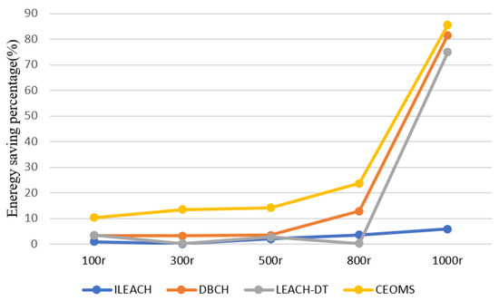 It can be found that WSNs which used CEOMS algorithm had a larger surface fluctuation, which meant using the CEOMS algorithm could save the energy of the nodes. Moreover, at the 100th, 300th, 500th, 800th and 1000th round, the percentage of energy saving related to the four algorithms is described in the Figure 15.