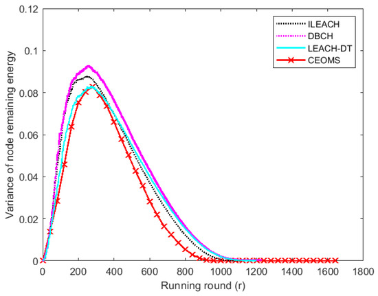 Figure 16 shows that the initial remaining energy variance of four algorithms was 0, which meant the initial energy distribution of WSNs was entirely uniform. With the running of WSNs and changing of mobile sink location, the curve corresponding to CEOMS algorithm was always under the curves corresponding to other three algorithms. Moreover, variance of residual energy of ILEACH, DBCH, LEACH-DT and CEOMS algorithm reduced to 0 at the 1111th, 1225th, 1199th and 1645th round, respectively, which indicated the CEOMS algorithm not only effectively balanced network load but also extended network life.