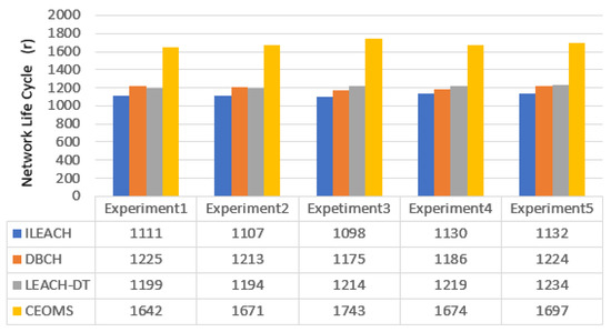 Several experiments were performed by randomly generating node positions. From the results of the five experiments shown in Figure 16, the total death times (network life cycles) of nodes in the network corresponding to the CEOMS algorithm were: 1642 rounds, 1671 rounds, 1743 rounds, 1674 rounds and 1697 rounds. Compared with the network life cycle data of the ILEACH algorithm, the DBCH algorithm and the LEACH-DT algorithm, the CEOMS algorithm had the longest network life cycle, indicating that the CEOMS algorithm could effectively extend the network life cycle and had applicability.