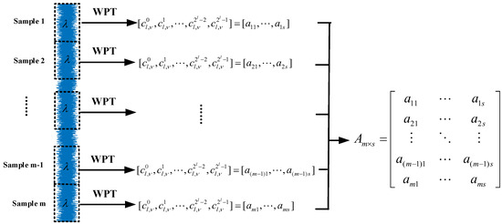 where is the sampling length of the signal. Therefore, as long as the type of wavelet packet function and scales l are selected, all of the wavelet packet coefficients of bearing signal sequence under the scales l are obtained by Mallat decomposition algorithm formula, where , is the number of nodes corresponding to the scales l [37]. Taking the scale as an example, Figure 3 shows the corresponding Mallat decomposition process. The characteristic matrix of bearing signal is constructed by wavelet packet coefficient , where m is the number of samples of bearing signal, is the length of a single sample, and is the number of all wavelet coefficients of a single sample at the scale l. The element in the matrix is the j-th wavelet packet coefficient energy at the scale l that is obtained by the i-th sample through WPT. Algorithm 1 and Figure 4 show the specific process.