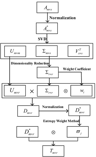 where is the normalized matrix of A, , is zero matrix, , is singular value, and are the unitary matrix. The order after dimensionality reduction is determined by the cumulative contribution rate of singular value that is greater than 90%. Subsequently, becomes , after dimensionality reduction. The weight is calculated according to the elements in