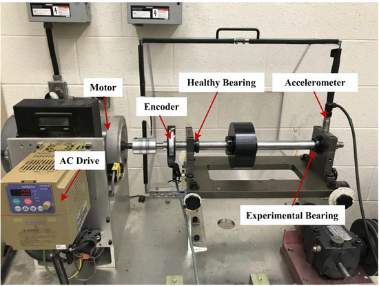 The time-varying bearing data from the University of Ottawa [39]. The experiments are performed on a SpectraQuest machinery fault simulator (MFS-PK5M). The experimental set-up is shown in Figure 6. The shaft is driven by a motor and the rotational speed is controlled by an AC drive. Two ER16K ball bearings are installed to support the shaft, the left one is a healthy bearing and the right one is the experimental bearing, which are replaced by bearings of different health conditions. An accelerometer (ICP accelerometer, Model 623C01) is placed on the housing of the experimental bearing to collect the vibration data. In addition, an incremental encoder (EPC model 775) is installed to measure the shaft rotational speed. To ensure the authenticity of the data, three trials are collected for each experimental setting. In this article, the operating speed condition selected is deceleration. Table 1 shows the operating speed and health status of the selected bearing.