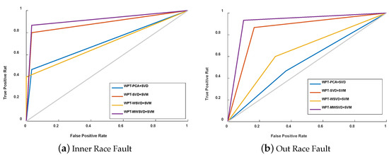 ROC curve diagram of the four algorithms on the fault diagnosis of the bearing inner race (a) and outer race (b).