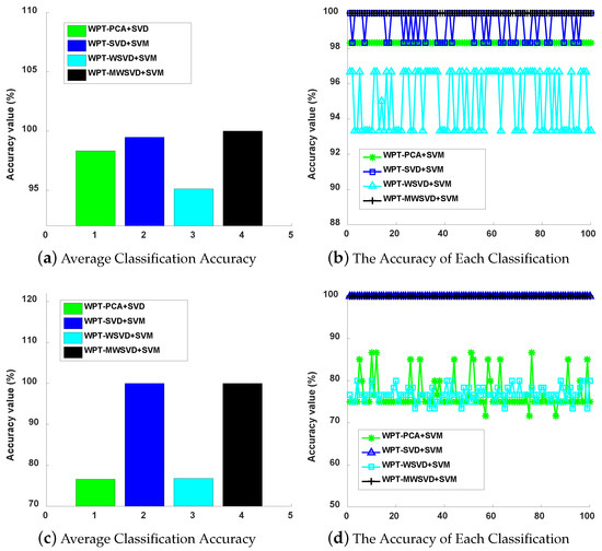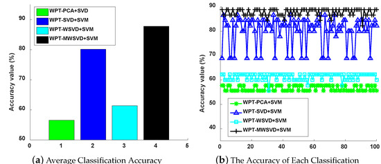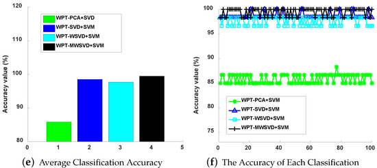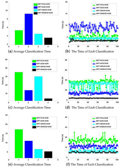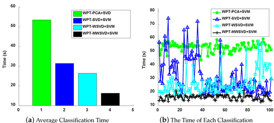 Figure 7 is the Receiver Operating Characteristic Curve (ROC) curve diagram of the four algorithms on bearing fault diagnosis in a single experiment. It shows that WPT-MWSVD+SVM can effectively diagnose the fault of the bearing inner race and outer race as compared to the other three methods. Figure 8 shows the Classification confusion matrix of four algorithms on bearing fault diagnosis in a single experiment. It can be seen that: WPT-WSVD+SVM and WPT-MWSVD+SVM can effectively distinguish the normal state of the bearing; WPT-MWSVD+SVM can effectively diagnose the inner race fault, and the diagnosis effect is better than the other three methods; WPT-SVD+SVM and WPT-MWSVD+SVM can both effectively distinguish outer race faults, and the diagnostic effect is much better than the other two methods. The four algorithms are run for 100 times in sequence, and the experimental results are shown in Figure 9 and Figure 10, Table 4. It can be seen that the average classification accuracy of this method is 87.87%, which is higher than the other three methods, and the average time used is 16.32 s, which is significantly lower than the other three methods. This shows that the proposed method has better computational efficiency and diagnostic accuracy. Besides, it can be seen from Figure Figure 9b that the fluctuation of the classification accuracy of this method is small. Table 4 shows the variance of classification accuracy. To examine the computational cost of this method in analyzing experimental data, refer to reference [42], and calculate the computational efficiency of the model based on the classification time; the related processing times are listed in Table 4. The results show that the average diagnosis time for WPT-MWSVD+SVM model diagnosis to collect 1 s sample data only takes 10.63 s. Therefore, the method proposed in this paper is superior to the other three methods for bearing fault diagnosis. Because the difference between the four fault diagnosis methods lies on the extraction of bearing fault features, this shows that the MWSVD feature extraction method proposed in this paper can effectively extract sensitive features of bearing information and it has good feature extraction capabilities.
