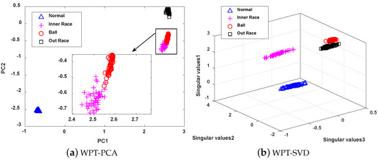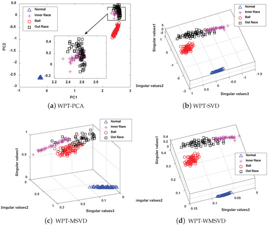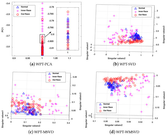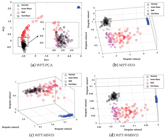 According to Algorithm 3, 60 groups are randomly selected from the state category of each bearing as the training set, and 60 groups are used as the test set, which are labeled according to the state category that they belong to. To illustrate the effectiveness of the proposed method, PCA, SVD, and WSVD [30] are selected as the comparison, Furthermore, the SVM classifier is obtained from the training set data, and the classification accuracy and diagnosis time of the test set data by the SVM classifier are used as the criteria for assessing the optimal diagnosis method. To further illustrate the effectiveness of MWSVD method that is proposed in this paper, after feature extraction three feature extraction methods are visualized and analyzed to observe the effects of feature extraction.