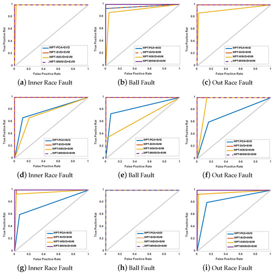 ROC curve diagram of the four algorithms: the minor fault diagnosis of the bearing inner race (a), Ball (b) and outer race (c); the general fault diagnosis of the bearing inner race (d), Ball (e) and outer race (f); the serious fault diagnosis of the bearing inner race (g), Ball (h), and outer race (i).