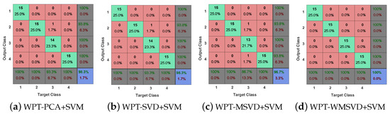 Classification confusion matrix of four algorithms: (a) WPT-PCA+SVM; (b) WPT-SVD+SVM; (c) WPT-MSVD+SVM; and, (d) WPT-WMSVD+SVM.
