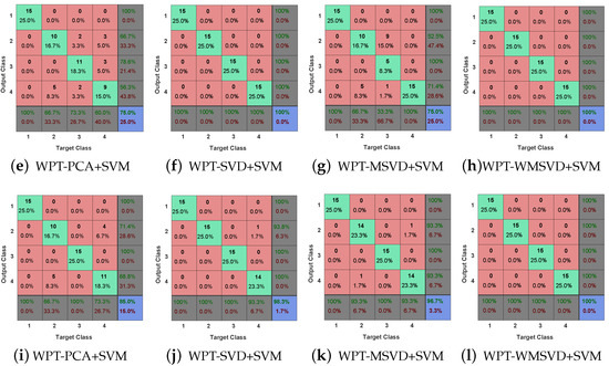 Classification confusion matrix of four algorithms: the minor fault (a) WPT-PCA+SVM; (b) WPT-SVD+SVM; (c) WPT-MSVD+SVM; (d) WPT-WMSVD+SVM; the general fault (e) WPT-PCA+SVM; (f) WPT-SVD+SVM; (g) WPT-MSVD+SVM; (h) WPT-WMSVD+SVM; the serious fault (i) WPT-PCA+SVM; (j) WPT-SVD+SVM; (k) WPT-MSVD+SVM; and, (l) WPT-WMSVD+SVM.