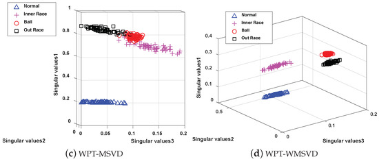 The four methods are visualized and analyzed to further illustrate the feature extraction capability of the MWSVD method constructed in this paper, and the results are shown in Figure 17, Figure 18 and Figure 19. It can be seen that the number of principal components extracted by PCA is less than the number of singular values extracted by the other three methods under the same cumulative singular value contribution rate. WPT-MWSVD has a more scattered distribution of data samples as compared with the other three methods, which can not only effectively improve the classification accuracy of subsequent fault diagnosis, but also effectively shorten the fault diagnosis time, which corresponds to the results shown in Table 7. Therefore, the MWSVD method that is constructed in this paper can effectively extract bearing signal features and improve the classification ability of SVM classifier.