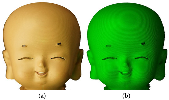 Compared with the most commonly used approaches, as discussed in the Introduction, the improvements that we made include the following aspects. The first advantage is that the individual participant does not need to be kept in a motionless state, and the proposed method of this work can even obtain high-accuracy reconstruction for a moving participant, as shown in Figure 9b. The second advantage is that our method only needs one-shot measurement for facial reconstruction, while the commonly used approaches usually need repeated scans or multiple images, for which it would also be difficult for a participant to be kept in a stable position for a longer time. The third advantage is that our method is capable of resulting in high-accuracy reconstruction when the background illumination exists, as shown in Figure 8d,f and Figure 9b, while background lighting is not allowed for the most commonly used approaches.