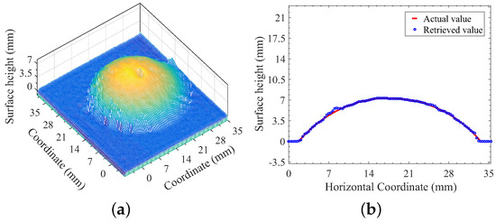 Reconstruction of the spherical cap of vulcanized silicone rubber: (a) reconstruction using the measurement of Figure 3c; and (b) error of reconstruction.