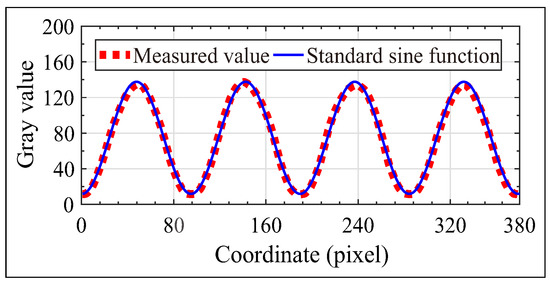 According to the physical basis of sinusoidal fringe pattern generated in our approach and the FTP-based method discussed above, the reconstruction of human face can be affected by the intensity, contrast and spatial frequency of the projected fringes and the background illuminance. The contrast of the monochromatic fringe pattern generated using the optical system sketched in Figure 1 is approximately equal to unity for a dark background environment, which can be concluded from Equation (9), and was validated using experimental results, as indicated in Figure 5. The light-intensity distribution of the sinusoidal fringe pattern generated using the developed optical system was measured using a CMOS camera with an Aptina CMOS sensor with a size of 5.70 × 4.28 mm and each pixel size of 2.2 × 2.2 μm. It was confirmed that the generated fringe pattern is featured by being monochromatic, time-invariant, high contrast and truly sinusoidal, which is critically important for the measurement and reconstruction of human face in this investigation.