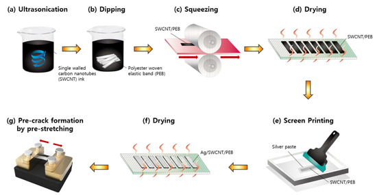The manufacturing process for strain sensors based on polyester woven elastic band (PEB): (a) ultrasonication of single-walled carbon nanotube (SWCNT) ink; (b) dipping PEB into SWCNT ink; (c) squeezing SWCNT/PEB; (d) drying SWCNT/PEB; (e) screen printing for silver-paste coating; (f) drying Ag/SWCNT/PEB; (g) pre-crack formation by pre-stretching to make pre-cracked Ag/SWCNT/PEB.