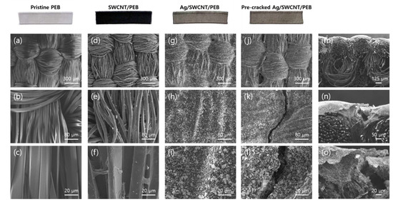 Top-view SEM images of pristine PEB at 300 um (a); 80 um (b); 20 um (c); SWCNT/PEB at 300 um (d); 80 um (e); 20 um (f); Ag/SWCNT/PEB at 300 um (g); 80 um (h); 20 um (i); Pre-cracked Ag/SWCNT/PEB at 300 um (j); 80 um (k); 20 um (l); Cross-sectional SEM images of pre-cracked Ag/SWCNT/PEB at 125 um (m); 50 um (n); 20 um (o).