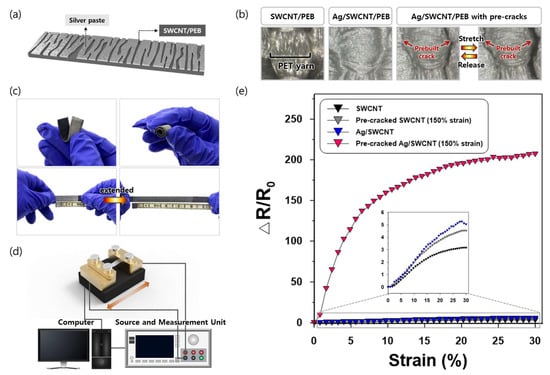 (a) Schematic structure of the pre-cracked strain sensor; (b) Pre-crack morphology of the pre-cracked strain sensor; (c) Flexibility of the pre-cracked strain sensor; (d) Customized Universal Testing Machine (UTM); (e) Relative changes in resistance versus strain of non-cracked SWCNT, pre-cracked SWCNT, non-cracked Ag/SWCNT, and pre-cracked Ag/SWCNT sensors.