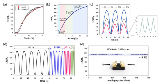 Figure 6c shows the electrical responses of the sensor under various dynamic strains, with a frequency of 0.01 Hz. The output signals were highly reversible and stable during the three stretching–releasing cycles, which could be due to the high elasticity of the sensor. In addition, our sensor exhibited clear signals even with the very small strains of 1%. To verify the stability of the sensor at higher frequencies, we also tested the dynamic responses by increasing the frequencies from 0.1 to 1 Hz (Figure 6d). The sensing patterns showed no obvious changes in amplitudes at various frequencies, demonstrating that the pre-cracked strain sensor can display stable performance over a broad frequency range. Dynamic durability indicates that a sensor can retain its performance under repetitive stretching–releasing cycles, which makes it appropriate for use in long-term applications. As shown in Figure 6e, the relative changes in the resistance of the sensor remained nearly unchanged, with less than 6.9% change after the 5000 loading cycles. (Figure 6e).