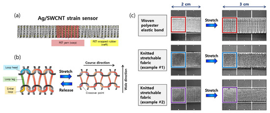 However, given that a woven fabric contains elastic fibers, this structure may be particularly beneficial with regard to pre-crack generation on textile substrates. As shown in Figure 7a, two independent yarns comprise woven PEB in perpendicular directions: PET yarn (warp) and PET-wrapped rubber (weft). Under applied strain, the stretch and recovery of the rubber yarn are less dependent on other components (i.e., warp yarns). This helps the cracks in the brittle silver coating along the warp direction close and open much more easily. In contrast, a knitted fabric is based on interlocking loops (Figure 7b). The gaps between the loops can also increase when stretched; however, the extension around the loop head is limited because the adjacent sinker loop raises the friction at the crossover points [32], which may adversely affect crack propagation.