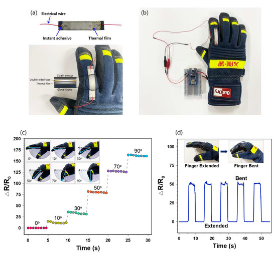 (a) Structure of the sensor integrated into the firefighters’ glove; (b) Prototype of the finger-motion-sensing firefighter’s glove; (c) Relative resistance changes of finger bending at different angles; (d) Relative resistance changes of cyclic finger motions of extending and bending.