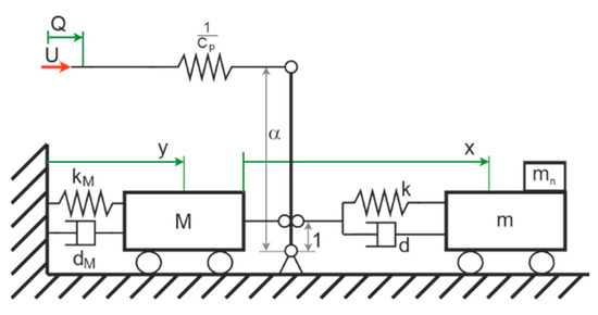For analytical purposes, we applied a simplified model based on a system with ideal lumped parameters; two degrees of freedom; and discrete stiffnesses, damper, and masses. The piezoelectric effect—which is used for actuation and sensing—can be included through the second electro-mechanical analogy, e.g., see [25]. By utilizing a parameter comparison of the equations for electrical and mechanical discrete components, the analogy was traditionally derived. In the herein-used second analogy, displacement is equivalent to electric charge and force is equivalent to current. An ideal transmission element such as a lever can transfer energy from one domain to the other. However, the lever parameter consequently has a unit. The model is depicted in Figure 3.