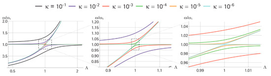 Parameter dependence of the system eigenfrequencies and for a variation of the frequency-mistuning parameter . The zoom-level is increased from the left to the right in the plot. The used parameters were: m = 1 kg, k = 1 N/m, and .