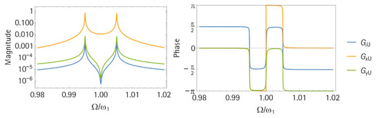 The harmonic frequency response was easily computed with Equations (14)–(16). Figure 5 shows an exemplary result. This case was for , where the two system resonances and were clearly visible in all three curves, and in and , an additional anti-resonance appeared at , which is the optimal vibration migration frequency for the application of a tuned mass damper. Remarkably, there was no further antiresonance frequency in that could be expected, possibly due to the already high transmission factor . This is promising because the corresponding phase zero crossing can potentially be used to track with a phase feedback control. This is also the case for the two phase zero crossings at and . For these two frequencies, self-oscillation circuits can be also applied to operate the system at resonance.