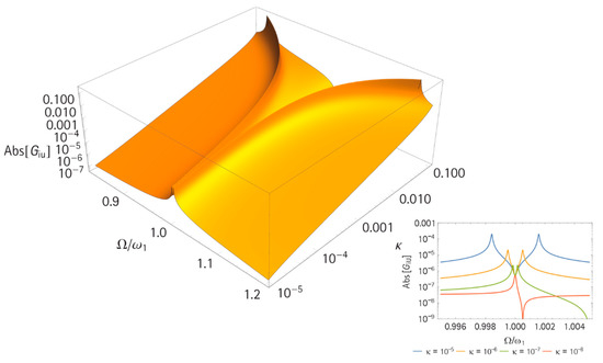 Interestingly, the more we zoomed in (figures from left to right), especially for smaller , a coupled region appeared in approximately , which showed that, even then, the co-resonance concept might be useful. However, the matching required extreme precision: for , and should have deviated less than . Consequently, the larger resonator should be as small as possible.