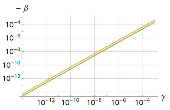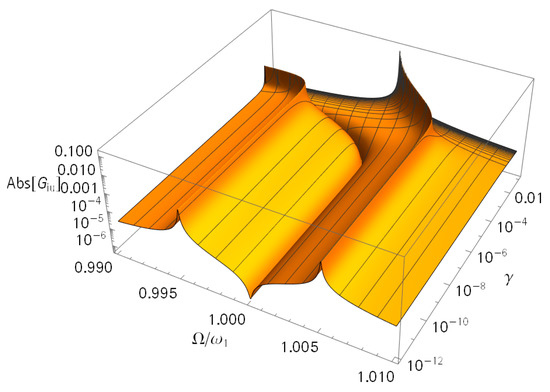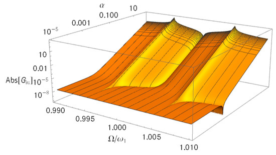 In our case, the mass was always larger than m, and the coupling decreased with a smaller mass ratio . This was clear for a very large where any motion of m was negligible for the behavior of . In the case that m and were similar in weight, an interaction existed. One possibility to show this interaction was to investigate the system’s eigenfrequencies.