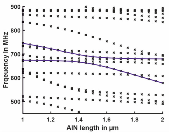 Parameter dependence of all eigenfrequencies on the different length of the piezoelectric element in the frequency range from 450 to 900 MHz, as indicated by makers. The lines show the change of the two utilized eigenmodes and .