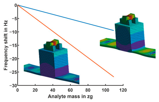 The frequency shift, due to the analyte mass, of the two coupled modes have been computed by modal analysis. The results are shown in Figure 11 with unloaded frequencies of 666 and 697 MHz. The frequency shift is determined by and , respectively, where the index “0” indicates the unloaded case. The uncoupled frequencies could not be determined since the boundary conditions were too complex. To estimate the sensitivity to the analyte mass, a small element (25 × 25 × 25 nm) was attached to the top center of the nano-beam. The weight was adapted by changing its density.