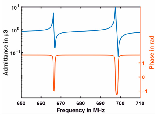 Electrical behavior is crucial for the sensing process; therefore, a harmonic simulation was computed. The system was driven with a 1 V amplitude, and the corresponding frequency response is shown in Figure 12. It was evident that the capacity dominated (compare Figure 7), hence two clear resonance–anti-resonance combinations appeared. Both had a phase zero crossing, and the minimum phase was about −60°, which was sufficient for both PLL tracking and a self-oscillation approach. The dominant capacity did not allow for the tracing of the frequency by a PLL circuitry for this parameter combination. However, the simulated results underlined that the novel concept of combining a longitudinal and a bending resonator is feasible and very promising.