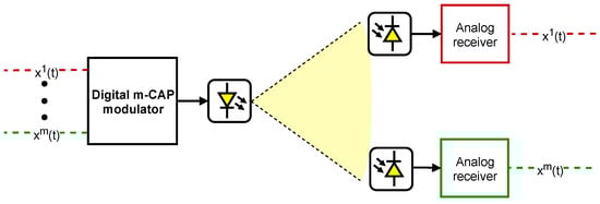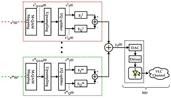Figure 3 presents the emitter’s block diagram, i.e., the digital m-CAP modulator. It represents several m data streams, intended for different users, each modulated in Quadrature Amplitude Modulation (QAM), formatted by two pass band filters (Hilbert pair) and added in the time domain to generate a digital m-CAP modulated signal, . This signal is then converted to the analog domain and transmitted as light with an LED. The impulse response represents the combined impulse responses of the Digital-to-Analog Converter (DAC), the LED driver circuit, the LED, and the VLC channel.