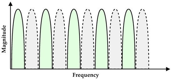 - Analog demodulation with a continuous spectrum may negatively impact the data recovery due to the non-ideal frequency response of analog filters, i.e., it has a finite value decay. Therefore, by fixing and varying , guard bands are created as shown in Figure 7.